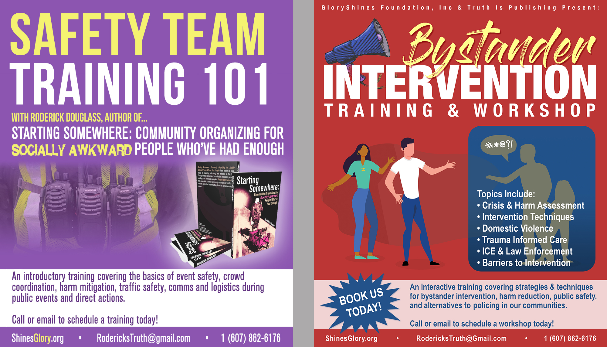 Bystander Intervention, Protest Safety, Flyer Design, Book Readings, and Event Consultation are some of the many trainings and services we offer. Call us today for scheduling!